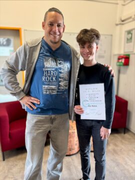 Náš šikovný student z 9.D Jan Hašek, postoupil do okresního kola anglické olympiády, kde získal 2. místo! Gratulujeme a na fotce předáváme diplom s panem učitelem angličtiny, Lucem Tonnerem.